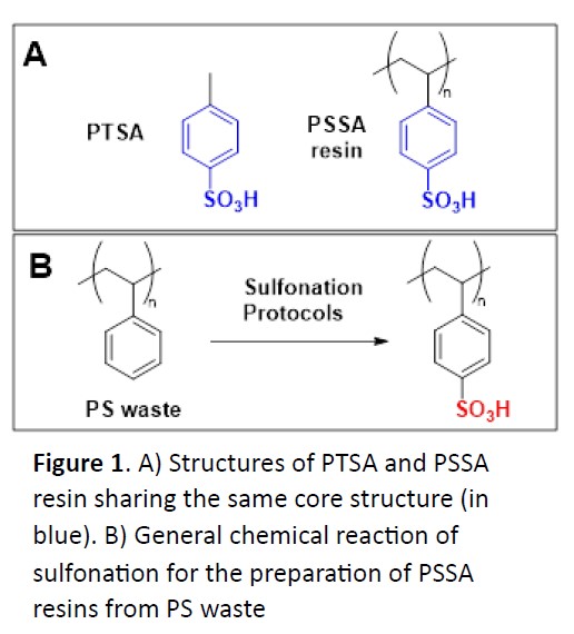 p-toluenesulfonic acid (PTSA) is an organic sulfonic acid commonly used in organic synthesis and catalysis. Polystyrene sulfonic acid (PSSA) resins are polymers in which the repeating unit has an identical core structure to PTSA (Figure 1A). PTSA is often used as a homogenous catalyst which is rarely recycled, while PSSA resins can promote the same organic reactions and be recovered and reused for several cycles.