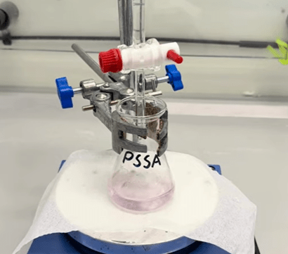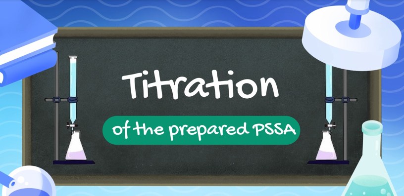 The degree of sulfonation is determined by titrating a sample of PSSA with a 0.01 M NaOH solution in water, using phenolphthalein as an indicator. Since PSSA is not soluble in water, the titration is performed as a suspension. The colour change can be slow and may lead to false positives, so the titration should only be considered complete if the pink colour (typical of phenolphthalein in basic solution) persists for 15–20 minutes. For better visibility, it is recommended to place a piece of white paper under the conical flask during titration.