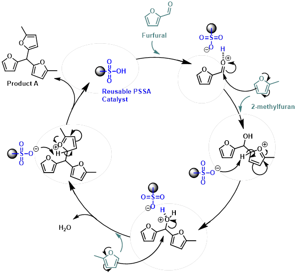 The reaction performed very well on a 0.5 mmol scale of furfural, using 0.5 mL of 2-methylfuran as both solvent and reactant. With 5 mol% of PSSA catalyst, the reaction was complete within 2 hours, yielding the product quantitatively. Since PSSA is insoluble, it can be easily recovered by vacuum filtration after the reaction (see Experimental Section).