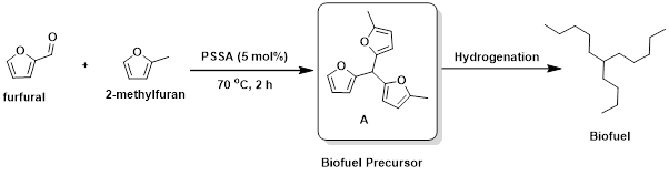 In our MSc Sustainable Chemistry programme at UCL, we focus on using biobased and platform chemicals derived from biomass for the synthesis of valuable organic molecules. At the time we developed the protocol for obtaining PSSA, one of our MSc research projects was investigating solid acid-catalysed reactions to produce biodiesel precursors. We decided to test our PSSA catalyst in the synthesis of biodiesel precursor A, using the biobased chemicals furfural and 2-methylfuran. Precursor A is just one hydrogenation step away from a biodiesel molecule.